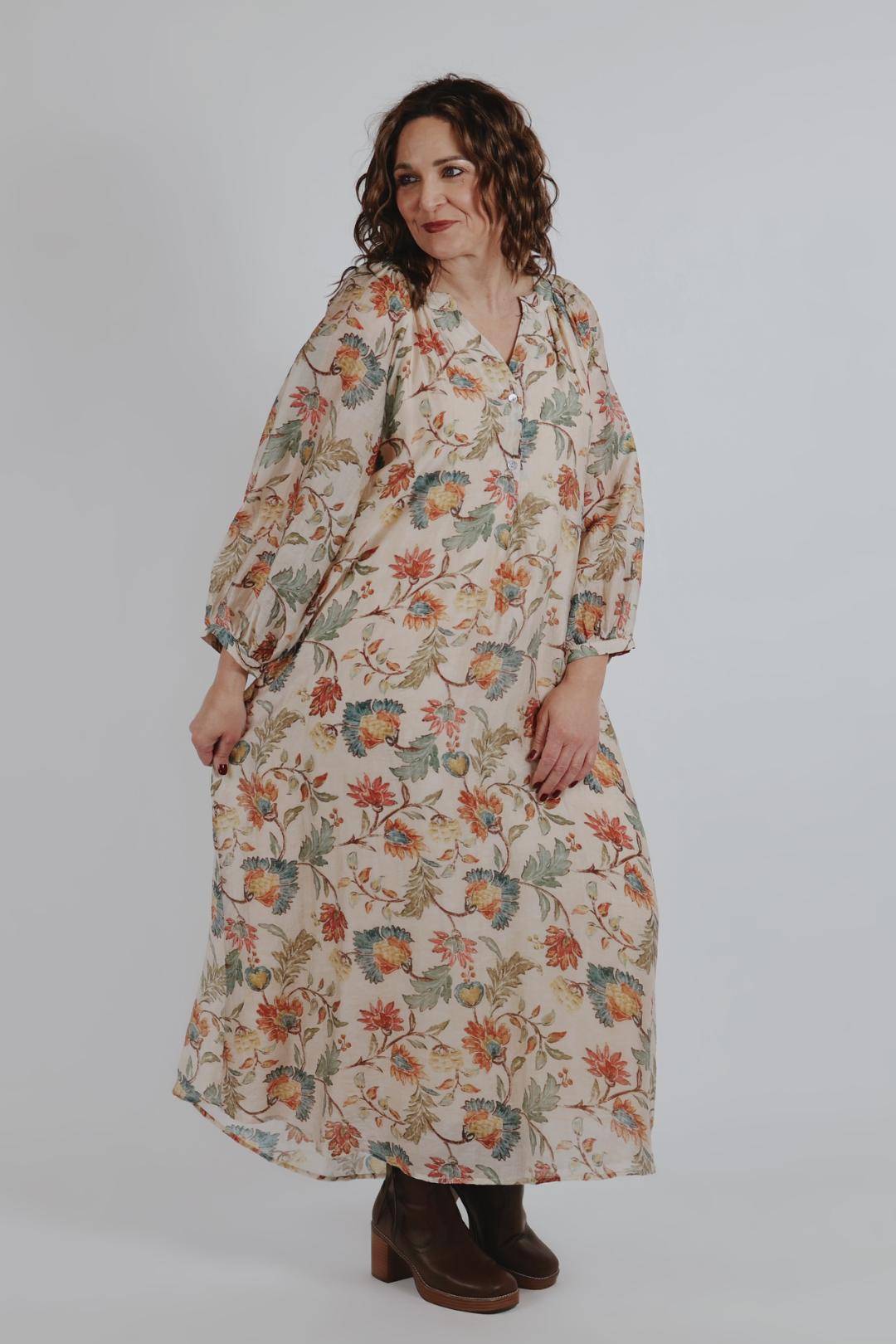 L'abito midi Autumn Garden cattura la bellezza della stagione con la sua morbida stampa botanica e la silhouette rilassata e naturale. Realizzato in un tessuto misto fluido e leggero, questo abito in tessuto presenta una scollatura a V, maniche lunghe con polsini abbottonati e un drappeggio che si muove con grazia a ogni passo.