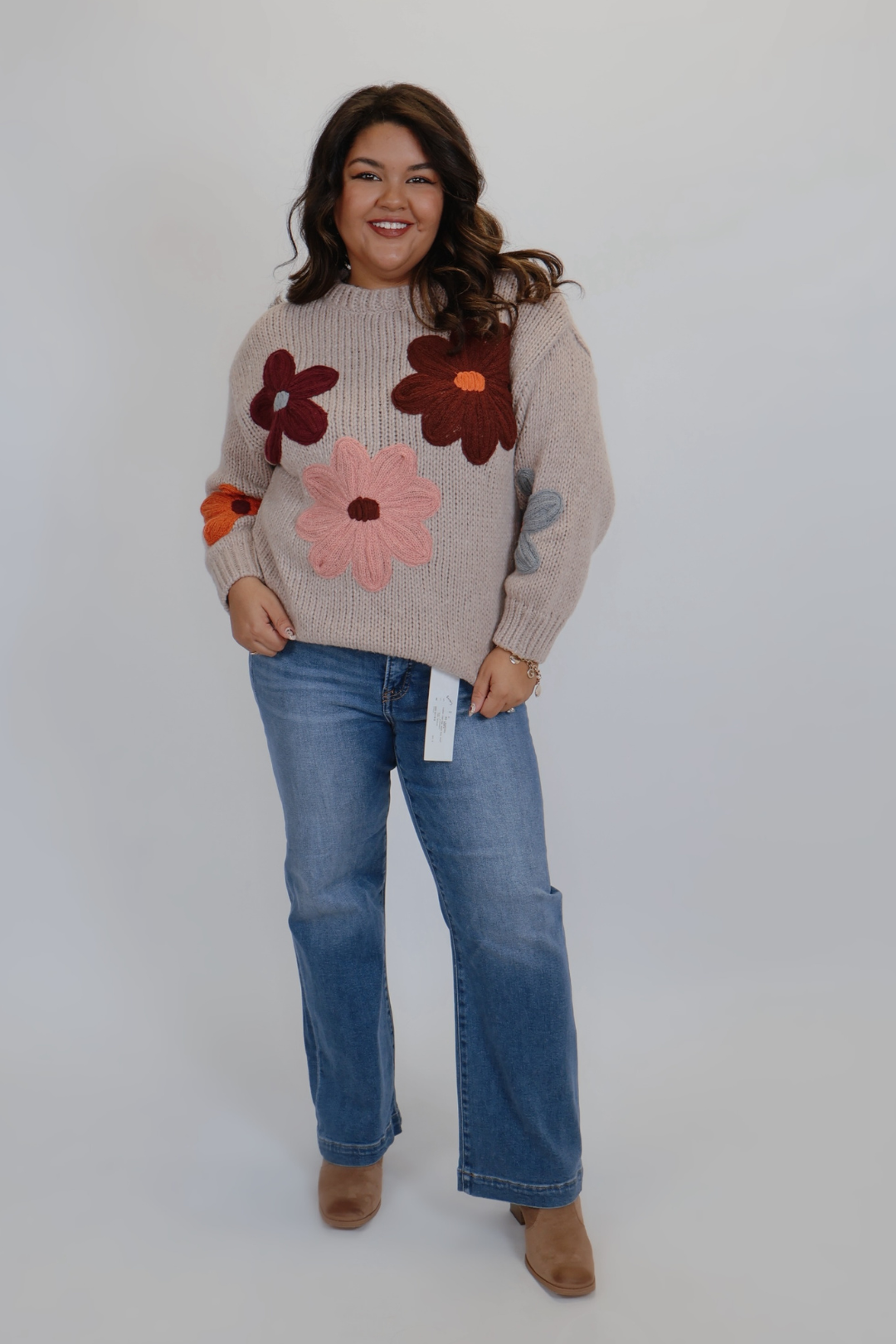 Maglia morbida color cuoio con vivaci fiori cuciti