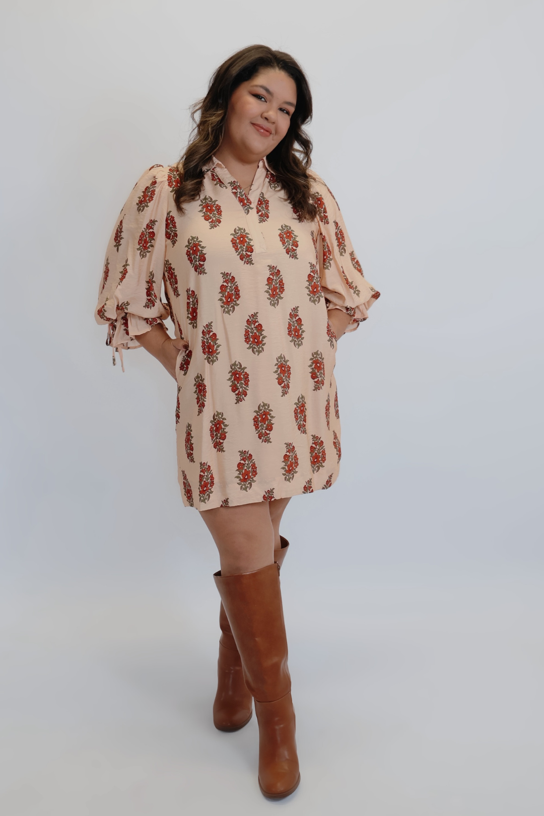 Fresco e femminile, il mini abito Blush Bloom è il capo perfetto per un'eleganza disinvolta. Realizzato con un'incantevole stampa floreale, questo leggero abito in tessuto presenta maniche a sbuffo con polsini con coulisse e un elegante laccetto posteriore in vita per una silhouette morbida e definita. La scollatura con spacco sul colletto aggiunge un tocco raffinato, mentre le tasche laterali nascoste lo rendono pratico e comodo per l'uso quotidiano.