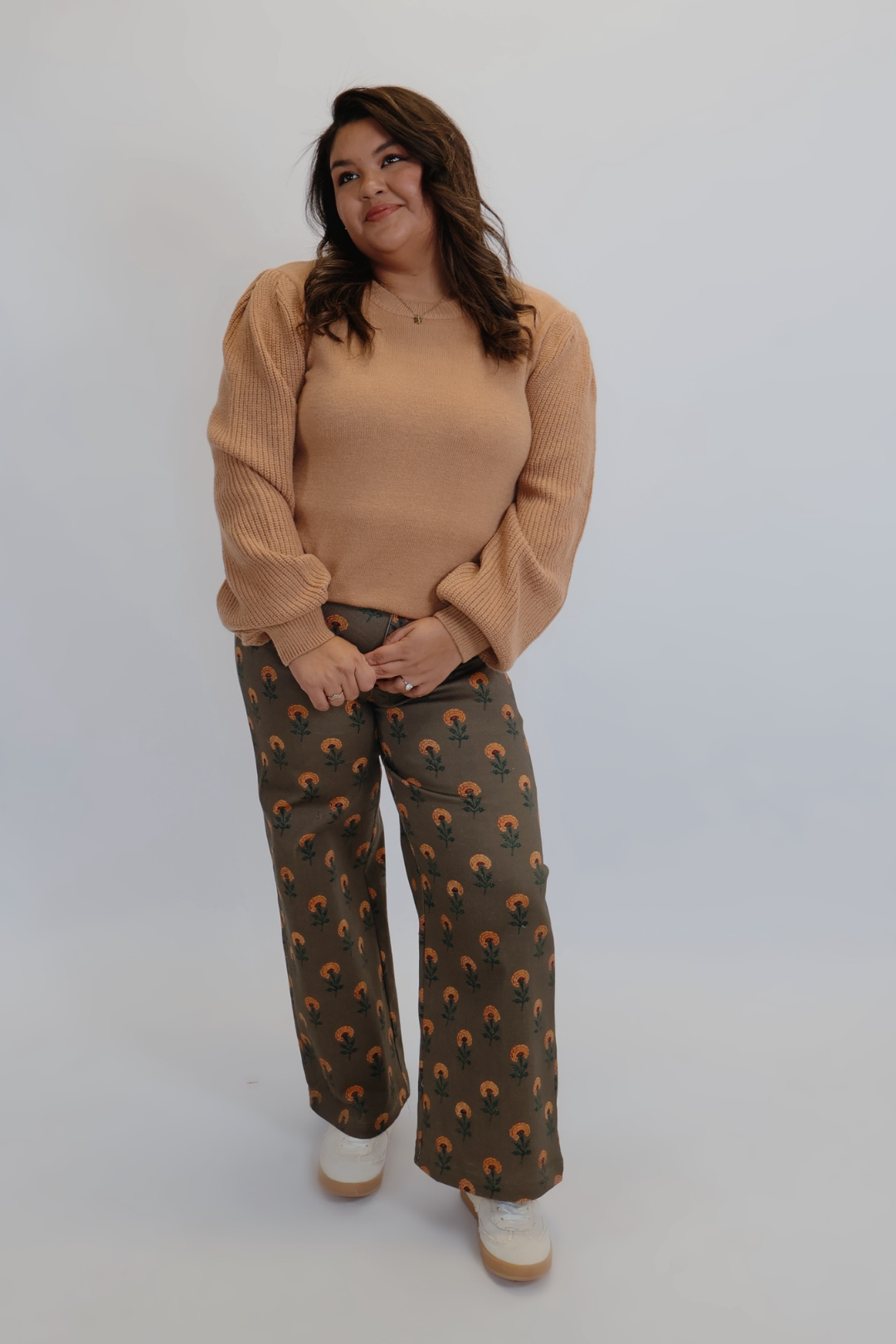 Morbido, classico e pieno di fascino: il nostro maglione con maniche a sbuffo in maglia color caramello è un capo essenziale e comodo, perfetto con un tocco femminile. Caratterizzato da maniche a sbuffo a coste con spalle arricciate, scollo rotondo e un lusinghiero orlo a coste, questo caldo tono caramello dona uno stile disinvolto a qualsiasi outfit.