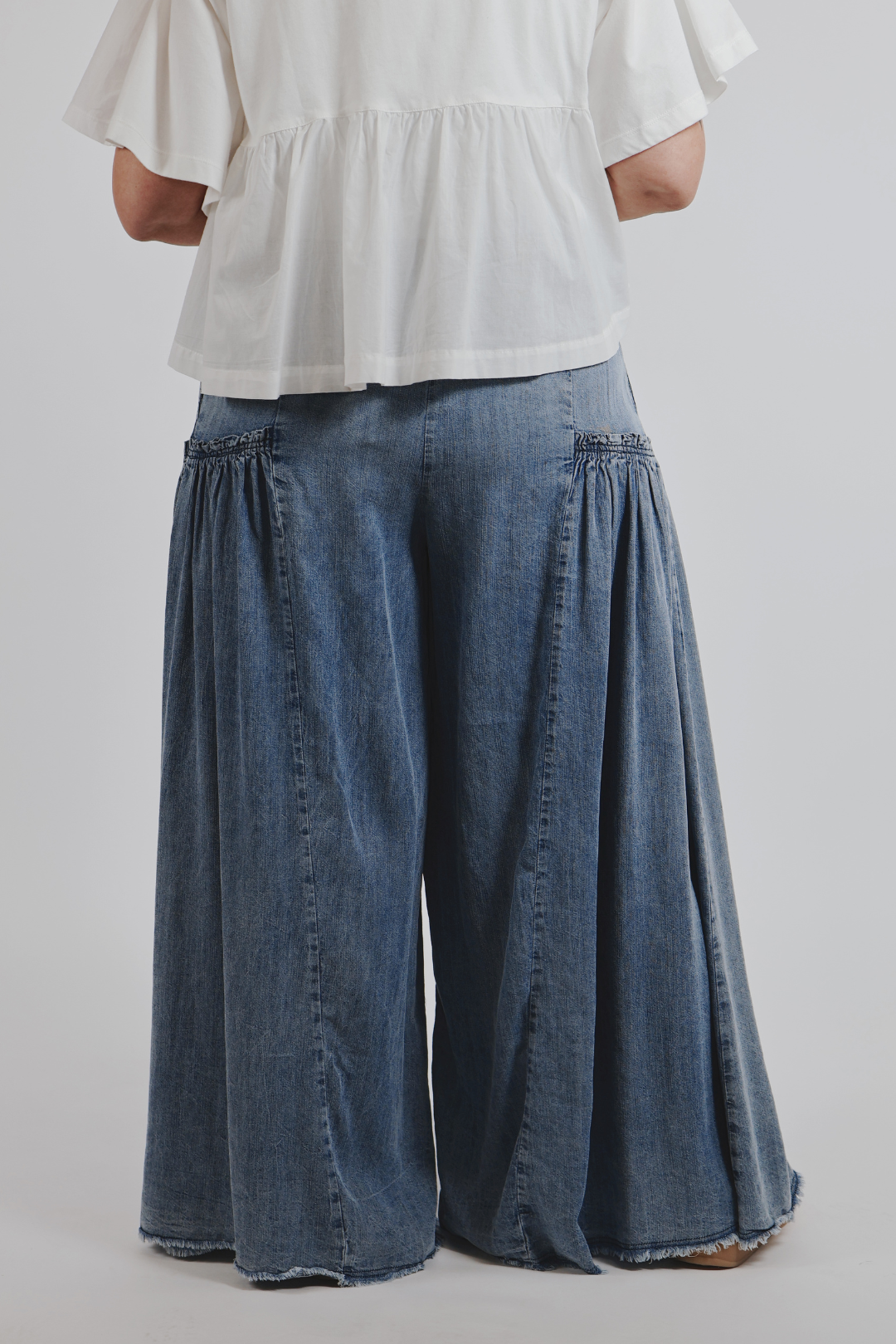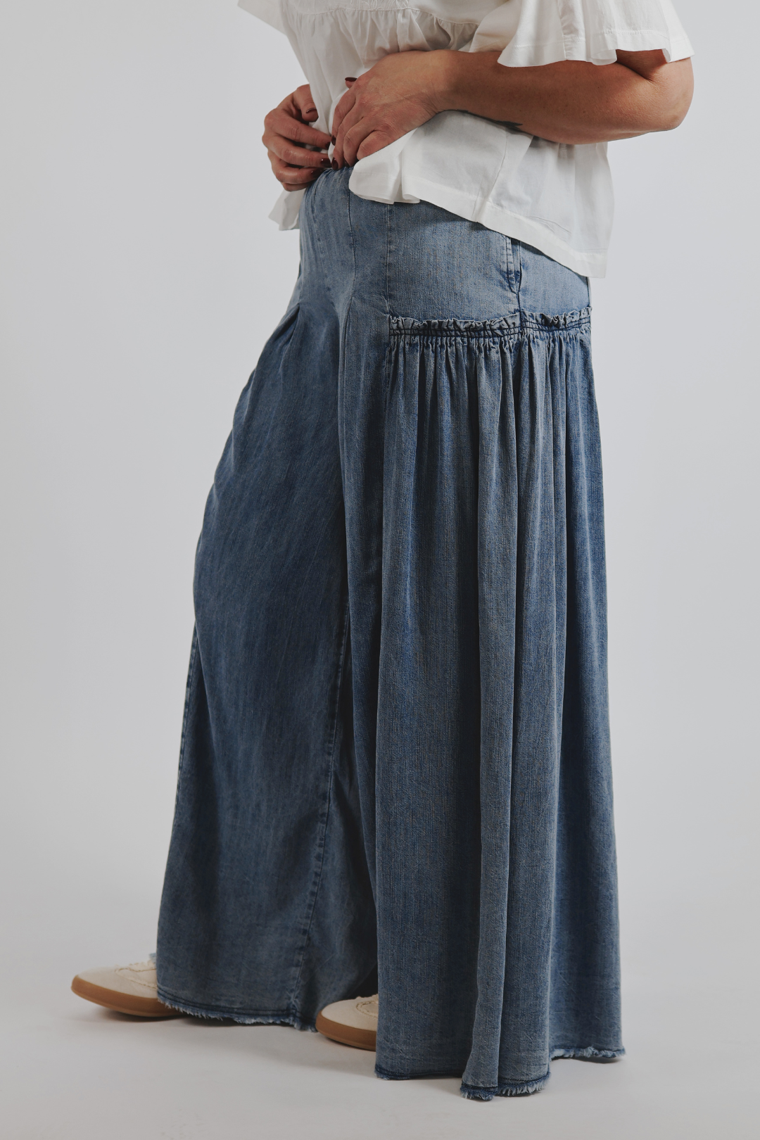 Ecco il modello morbido e fluido che il tuo guardaroba aspettava: i pantaloni palazzo Dreamy in chambray. Realizzati in leggero chambray Tencel al 100%, questi splendidi pantaloni a gamba larga offrono una vestibilità ariosa e ultra confortevole che si muove con te. L'elastico in vita assicura una vestibilità impeccabile, mentre i dettagli arricciati sui pannelli laterali aggiungono un tocco di dolcezza boho.