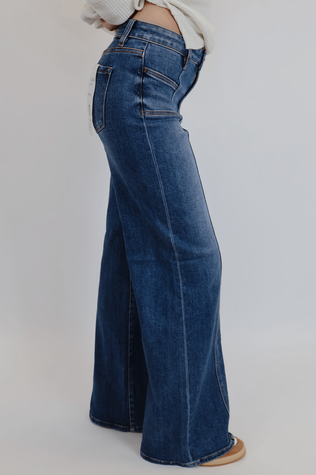 Attrai l'attenzione con i nostri jeans larghi a vita media, pensati per la donna moderna che ama una silhouette senza tempo con un tocco di stile. Questi jeans presentano una vita media che valorizza la figura e un audace taglio a gamba larga che si adatta a ogni passo. Il dettaglio che li distingue? Eleganti tasche anteriori applicate che aggiungono un tocco pratico e discreto, valorizzando al contempo la struttura sartoriale.