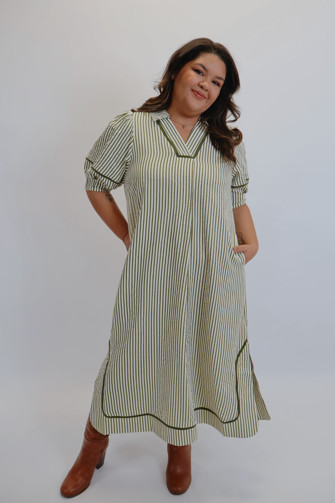 Sofisticato, leggero e chic allo stesso tempo: l'abito midi a righe Olive Lane è il tuo nuovo capo preferito per uno stile quotidiano raffinato. Progettato con una scollatura a V lusinghiera, un colletto morbido e dettagli di rifinitura a contrasto, questo abito conferisce un tocco moderno a un intramontabile motivo a righe. La lunghezza midi è elegante ma rilassata, con spacchi laterali per facilitare i movimenti e tasche laterali per un fascino funzionale. Le maniche a sbuffo aggiungono un tocco femminile discreto, rendendo questo abito perfetto sia per le uscite informali che per le occasioni eleganti.