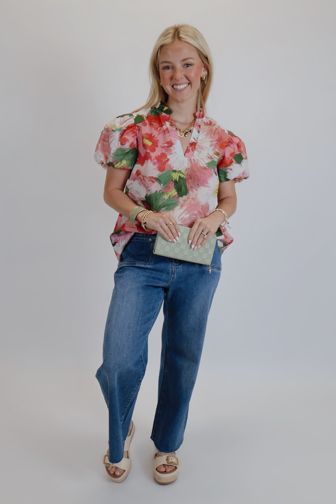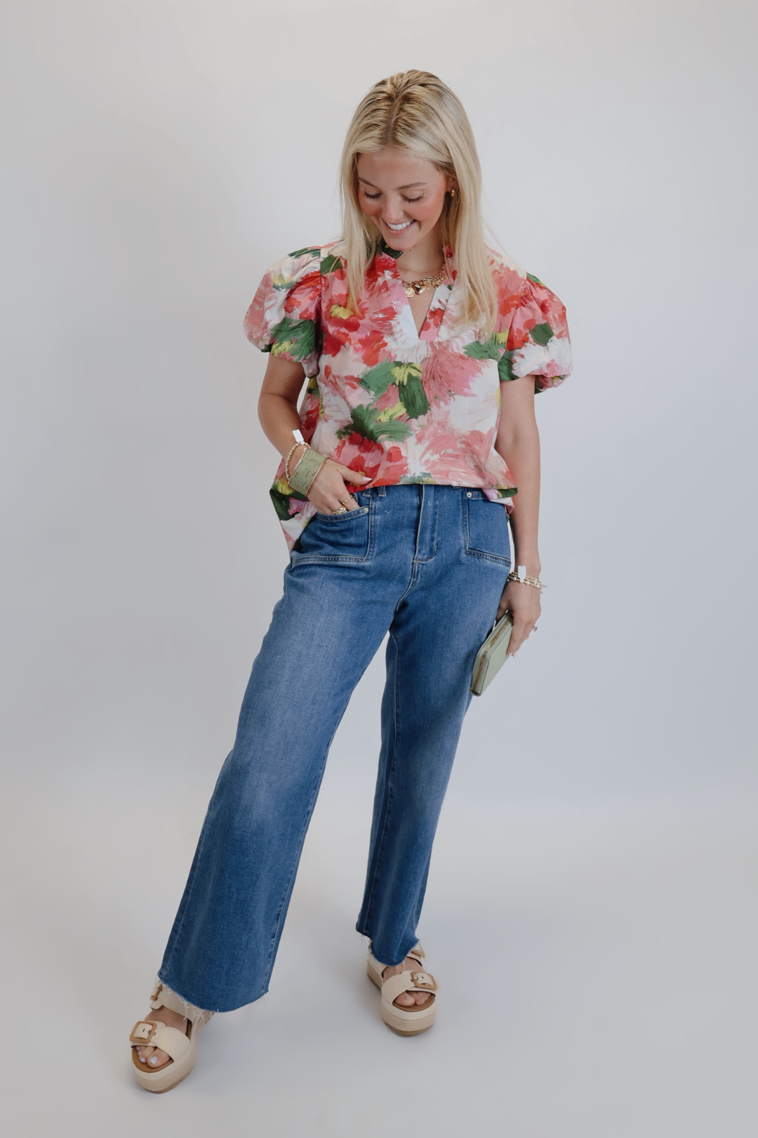 Attrai l'attenzione con il top con maniche a sbuffo Petal Parade, dove i fiori audaci incontrano un'eleganza frizzante. Questo capo d'effetto presenta una stampa floreale artistica in vivaci tonalità di rosa, bianco tenue e verde fresco, perfetta per ravvivare qualsiasi guardaroba. Le maniche a sbuffo offrono una silhouette affascinante, mentre la scollatura a V con intaglio aggiunge un tocco moderno. Progettato pensando al comfort e allo stile, è il tuo capo preferito per feste in giardino, gite del fine settimana o giornate informali che richiedono un tocco di bellezza.