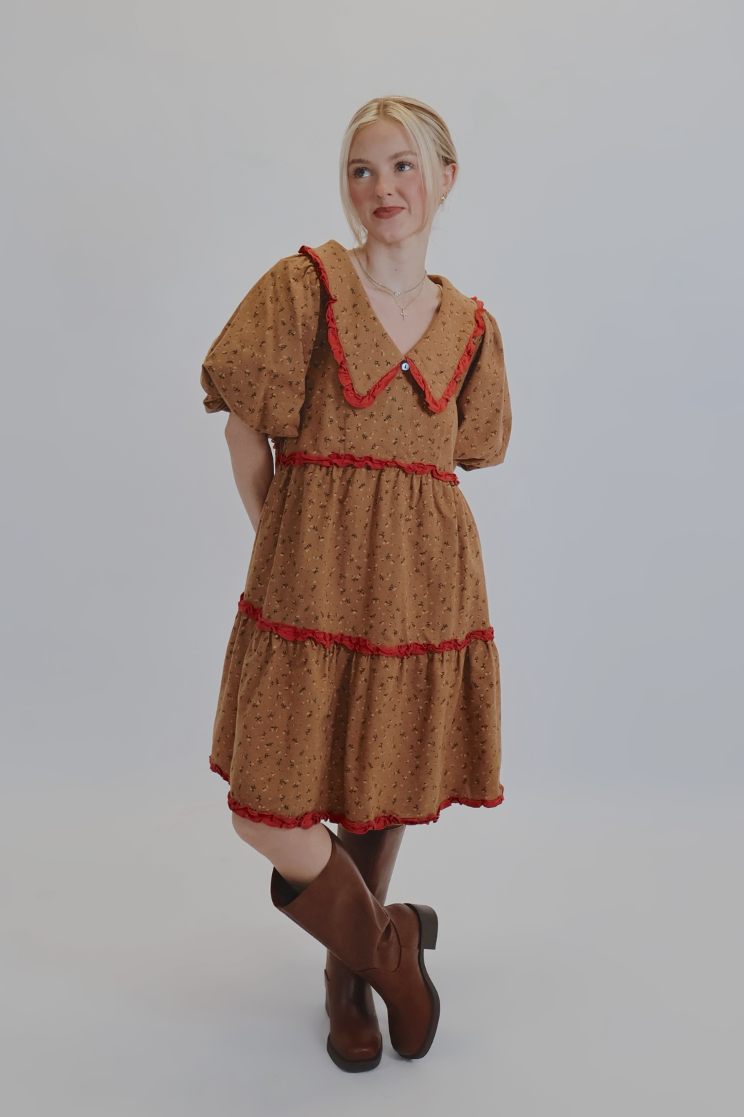 Cattura il dolce fascino country con il nostro mini abito in cotone Prairie Petal! Realizzato in morbido cotone lavato con minerali, questo adorabile abito presenta una delicata stampa floreale e un grazioso bordo a balze in una vivace tonalità a contrasto. Il colletto Peter Pan oversize aggiunge un tocco nostalgico, mentre la silhouette a trapezio a balze e le maniche a sbuffo lo rendono naturalmente femminile e lusinghiero. Rifinito con una chiusura frontale con bottoni per un tocco di ispirazione vintage, questo capo casual si abbina perfettamente ai tuoi stivali da cowgirl preferiti o alle tue ballerine casual.