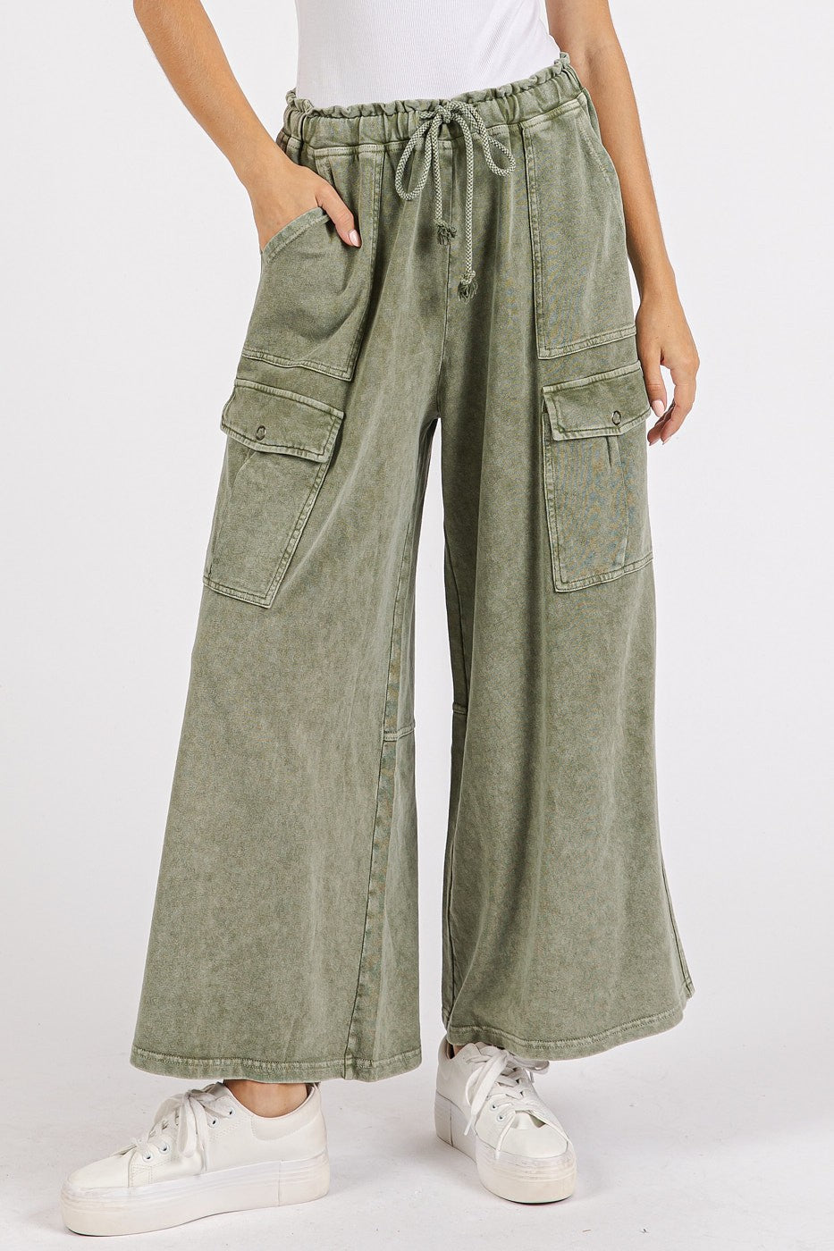 Un elastico in vita rivestito con coulisse regolabile garantisce comfort per tutto il giorno, mentre le tasche laterali e le pratiche tasche cargo con patta offrono ampio spazio funzionale. Le cuciture a vista completano l'atmosfera casual di ispirazione boho, rendendo questi pantaloni facili da abbinare a canotte, t-shirt e strati leggeri.
