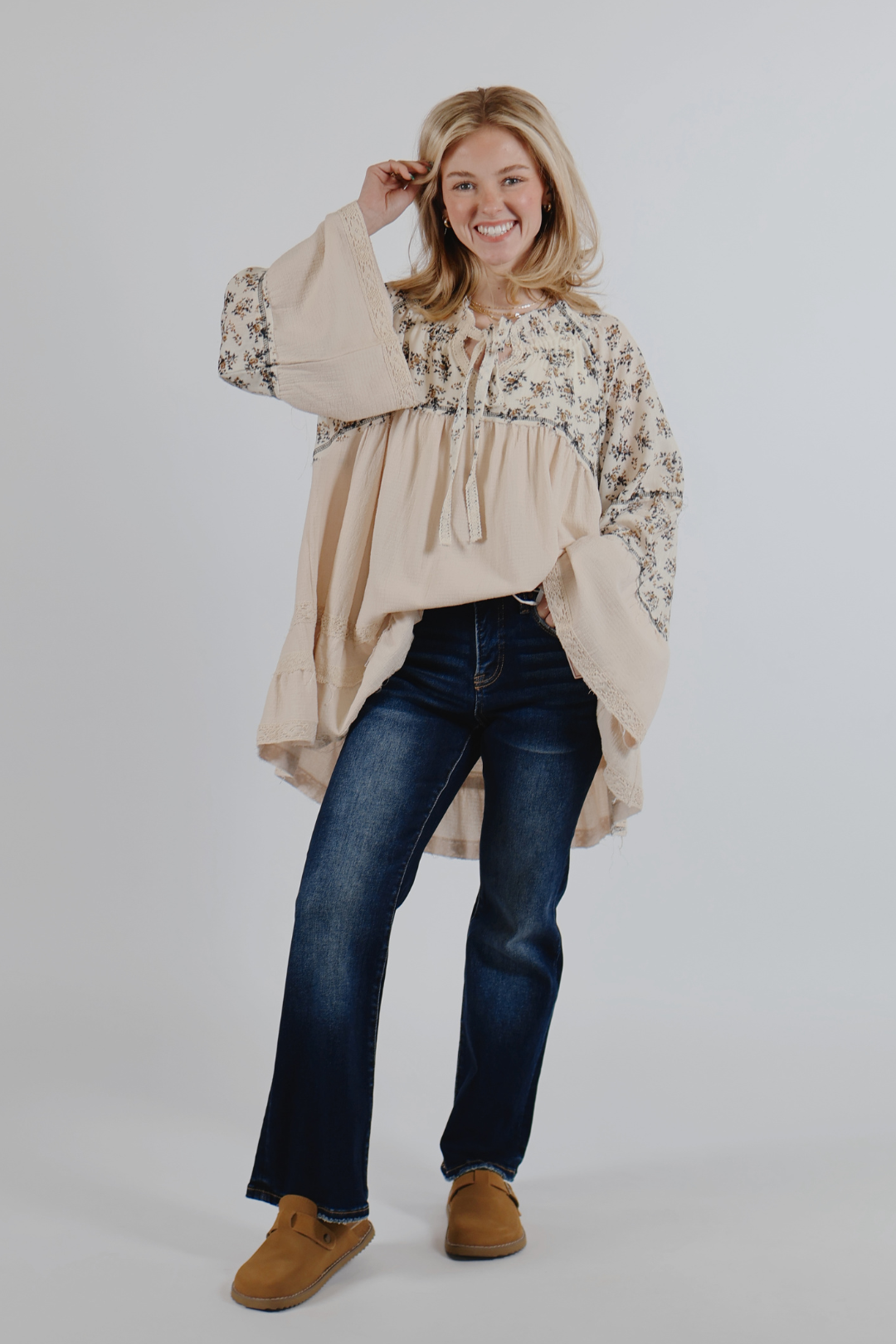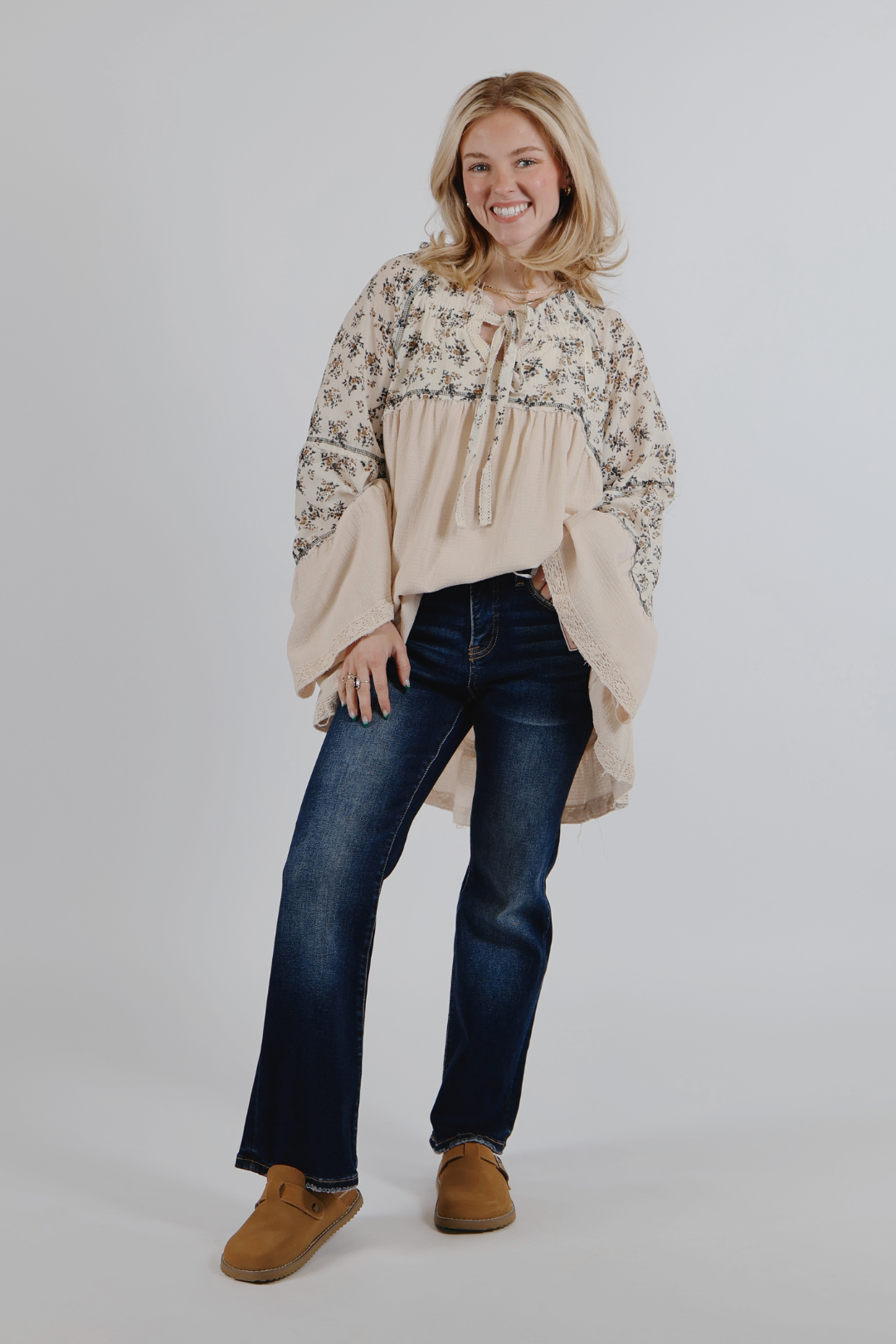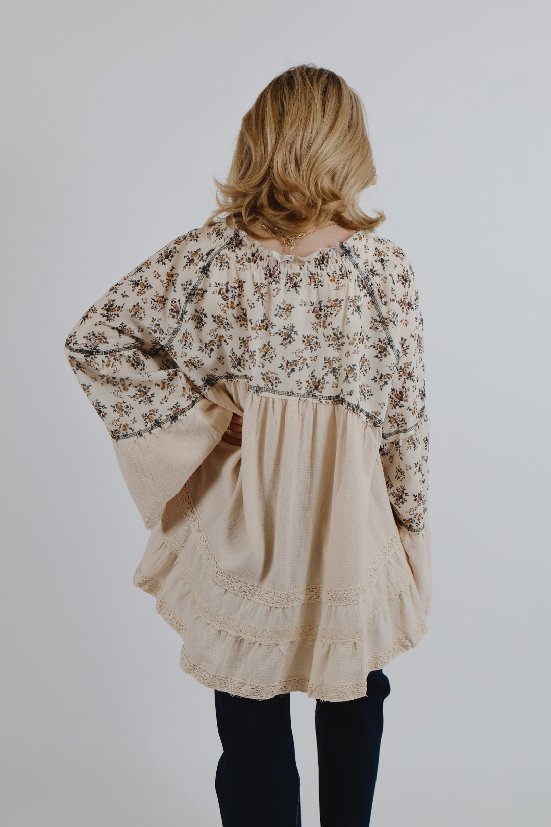 Morbido, femminile e naturalmente boho: il nostro top in garza Wildflower Whispers è il perfetto mix di romanticismo e comfort. Realizzata in leggero tessuto a doppia garza, questa blusa dalla vestibilità comoda presenta uno scollo a V con delicato smock e dettaglio annodato, maniche a tre quarti svasate e dettagli patchwork floreali per un tocco di fascino vintage. Rifiniture curate e cuciture overlock aggiungono consistenza e volume, mentre la silhouette fluida si muove magnificamente a ogni passo.